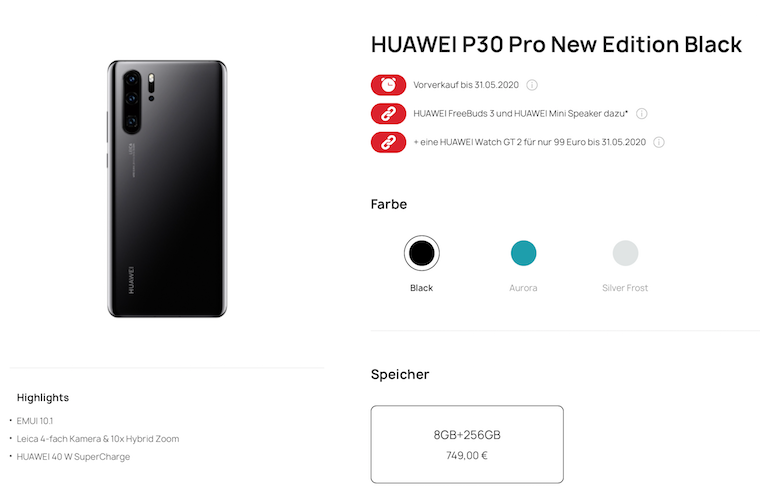 749ユーロのP30 Pro New Editionは、FreeBuds 3 などのアクセサリーが揃うとはいえ